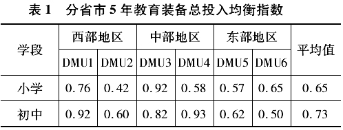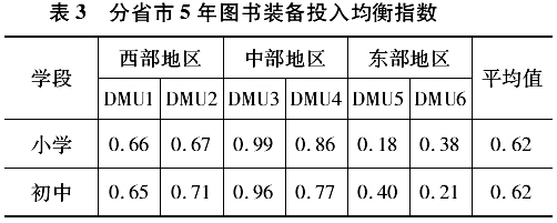 表3是分省市小学与初中学校图书装备投入的数据分布情况。数据显示图书装备均衡指数J分布的差异性很大,DMU3小学的均衡指数达到最大值0.99,几乎接近了1,而其初中的均衡指数值也达到了0.96;DMU5小学的均衡指数为最小值0.18;另外,DMU6初中的均衡指数值也比较小,为0.21。表3的最后一列开列出了小学与初中各省市图书装备均衡指数的平均值。如果参照基尼系数的取值定义,除中部地区的DMU3和DMU4外,其他地区小学与初中图书装备投入的均衡性非常好。