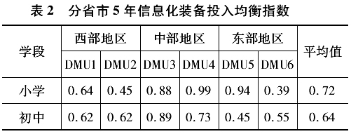 表2分省市小学与初中学校教育信息化装备投入的数据分布情况,从中可以看出学校信息化水平建设的差异性。其中,教育信息化装备均衡指数J普遍分布在0.4以上,比教育装备总投入的均衡性降低10个百分点。DMU4小学的均衡指数达到最大值0.99,几乎接近了1;DMU6小学的均衡指数为最小值0.39;另外,DMU5小学的均衡指数值也比较高,达到0.94。表2的最后一列开列出了小学与初中各省市教育信息化装备均衡指数的平均值分别为0.72和0.64。如果参照基尼系数的取值定义,除个别省市外,这些地区小学与初中教育信息化装备投入的均衡性还比较好。