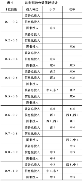 从表4中的数据还可以看出,全国6省市教育装备总投入的均衡性表现较为分散,主要分布在均衡指数J值的0.4至1.0之间;全国6省市信息化装备投入的均衡性表现与教育装备总投入的均衡性相似,也是主要分布在0.4至1.0之间;全国6省市图书装备投入的均衡性表现为两极分化,主要分布在0.1至0.4和0.6至1.0这两个区间。反映出教育装备总投入和信息化投入较为理性,而图书装备投入则比较随意。