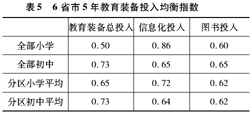 表5的第2、3行将6省市小学与初中学校教育装备总投入、教育信息化装备投入和图书装备投入均衡指数进行统计的结果。数据显示除了小学信息化装备投入均衡指数很大为0.86外,初中的教育装备总投入均衡指数比较大为0.73,其他都在0.5至0.7之间。如果参照基尼系数的取值定义,除小学信息化装备投入均衡性较差外,其他装备投入的均衡性都表现一般。
