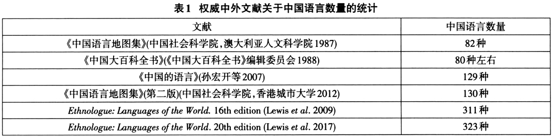 中国是世界上语言多样性最丰富的国家之一。中国语言的多样性不仅表现在语言谱系复杂,语种数量众多,并且语言(特别是汉藏语系语言)内部方言之间的相似度和可懂度也较一般意义上语言的方言变体更低,以致在中国同一语言的方言经常被国外学术界视为独立的语言。因此国内外关于中国语言数量的统计结果,存在着比世界上其他国家语言更大的差别。以权威中外文献关于中国语言数量的统计为例说明。(见表1)