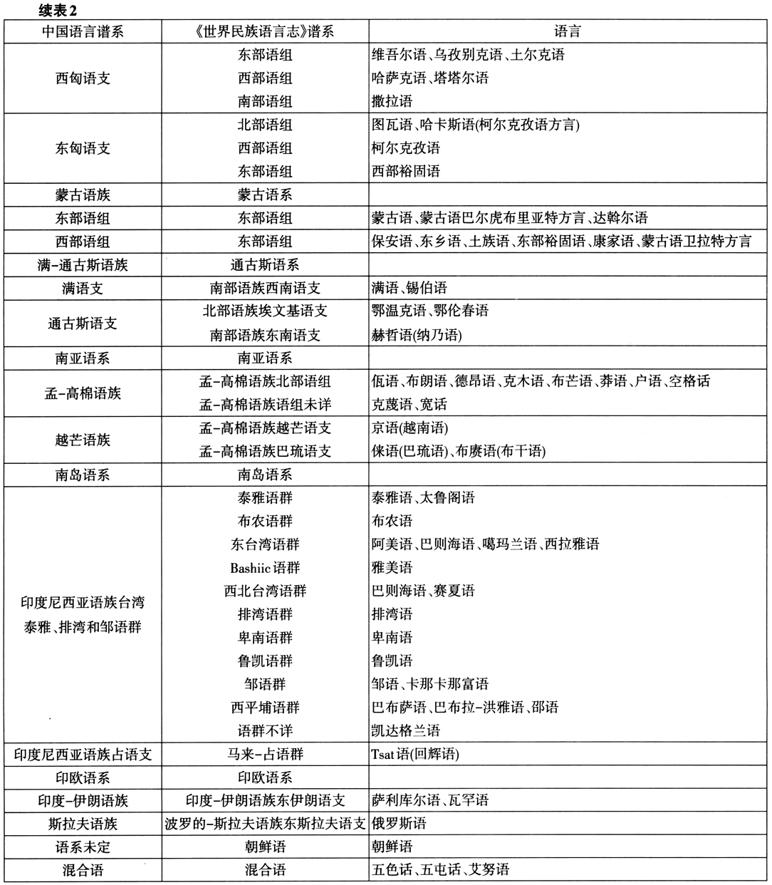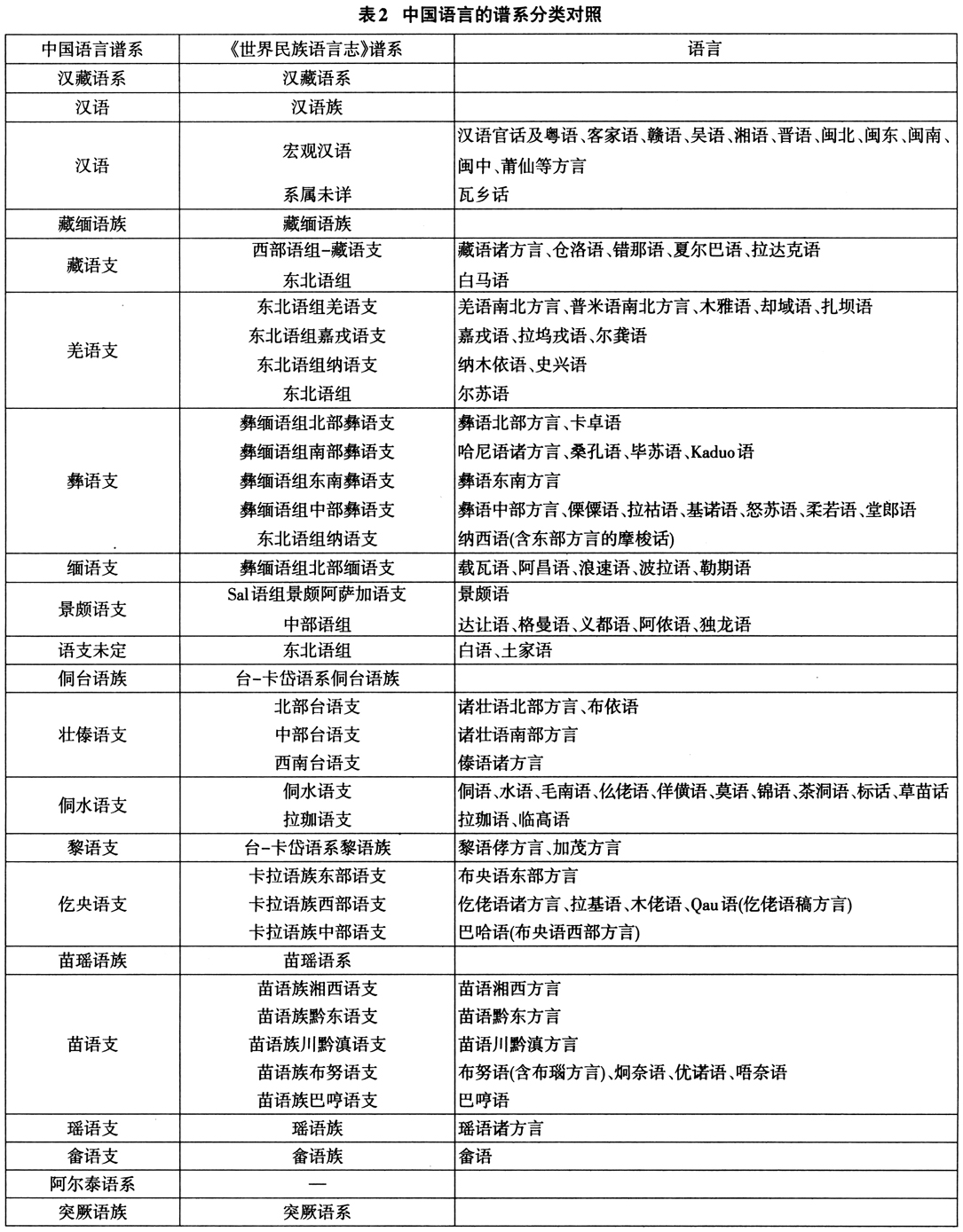 表2为中国语言两种分类体系对照的一览表。