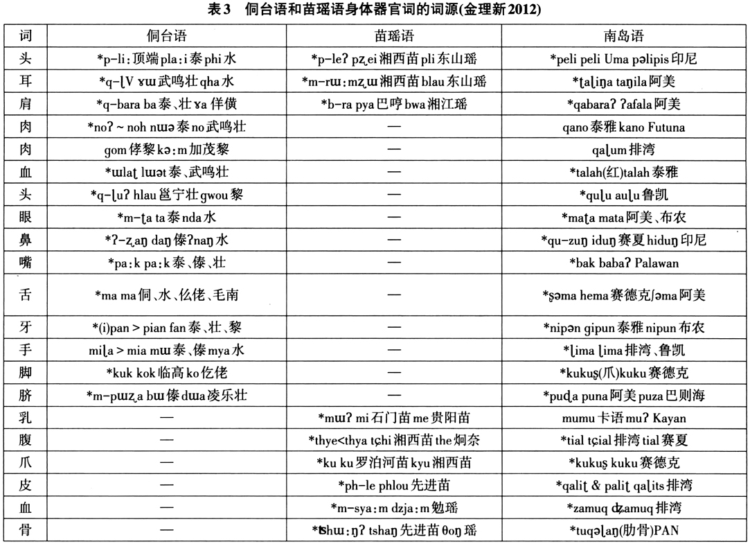 再看汉藏语系语言“共同的词汇”证据。传统上包括侗台语和苗瑶语的汉藏语系分类比较强调语系内部语族之间存在许多共同的词汇,随着新语料的公布及实证性研究的不断深入,这些“共同词汇”的词源也日益显明。下面以侗台语和苗瑶语最常用的一些身体器官词为例说明,这些核心词语多与汉藏语无关,却能与南岛语普遍对应。(见表3)
