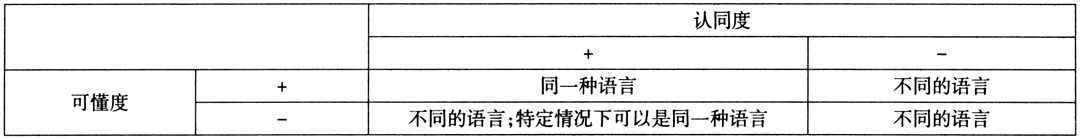 按此标准,语言可懂度是必要条件,语言认同是充分条件,即民族语言身份认同是比语言可懂度更重要的语言身份识别标准和条件。