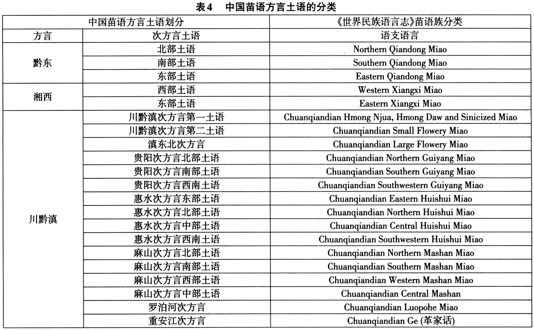 中国汉藏语系诸语族语言的方言差别一般都比较大,其方言土语之间的可懂度很低,基本不能通话。根据方言内部的差异程度,差异大的方言分次方言和土语两个层次,差异小的方言只分土语。有学者认为,苗语和彝语是汉藏语系方言可懂度最低的语言,也是《世界民族语言志》分立出独立语言最多的两种民族语言。下页表4列举了中国学界对苗语方言土语的分类系统[主要采用《中国少数民族语言简志》(2009)和《中国语言地图集》(2012)的数据],及其与《世界民族语言志》分类系统的对应情况。