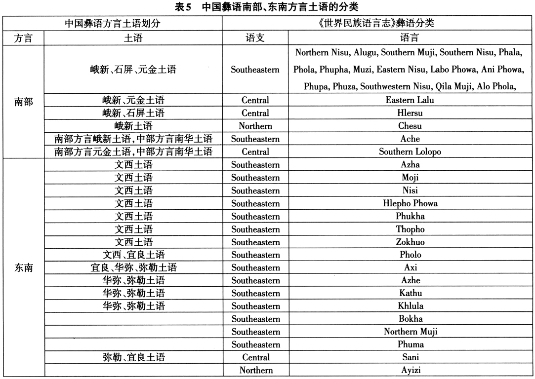 彝语可分6个大的方言区,其中东南方言内部的差异最大,孙宏开先生多次发文(如孙宏开2017)质疑其独立语言身份的诸多彝语变体即分布于此方言。该彝语方言内的阿细(Axi)、撒尼(Sani)、阿哲(Azhe)、阿吾(Awu)、濮拉(Pula)、大黑彝、小黑彝等支系相互通不了话(陈康2010)。下页表5是彝语较复杂的南部和东南部方言与《世界民族语言志》分类系统的对应情况。