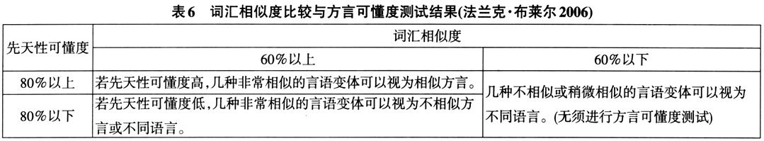 语言和方言可懂度很大程度在于词汇的相似度(lexical similarity),“从技术上讲,能够相互通解的言语形式称为方言;不能互相通解的言语形式则称为语言”(法兰克·布莱尔2006)。确定语言相似程度的方法有多种,但语言相似程度通常是在比较标准词表所收录词汇的对应情况之后,用语音相近的词所占词表词汇总数的百分比来表示。如果词汇比较的结果显示,两种言语变体之间的相似程度高于60%,就必须进行方言可懂度测试。假如词汇比较结果显示可懂度低于80%,那么这两种言语变体就可视为“不相似方言”或“不同语言”。如果方言可懂度测试结果显示,两种言语变体的可懂度很高(超过80%),那么这两种言语变体就可视为相似方言。词汇相似度与方言可懂度的交叉关系见表6。