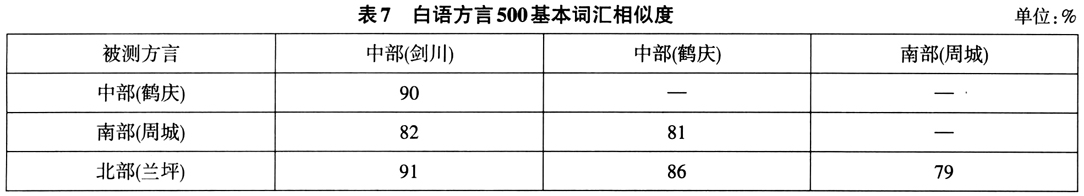 以藏缅语族的白语方言为例。白语分中部方言(以剑川话为语音标准)、南部方言(以大理话为语音标准)、北部方言(以碧江话为语音标准),诸方言之下又各分2个土语。有学者认为中部和南部方言比较接近,相互交谈能听懂一半左右,中部、南部方言与北部方言差别较大,尤其是南部和北部方言差别更甚(徐琳,赵衍荪1984)。艾磊(2004)用词汇相似性比较和可懂度测试的方法分析了白语的方言差异,结果如表7。