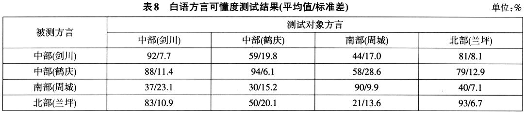因诸白语方言的词汇相似度大于60%,即可进一步进行方言可懂度测试。白语方言可懂度测试结果如表8。