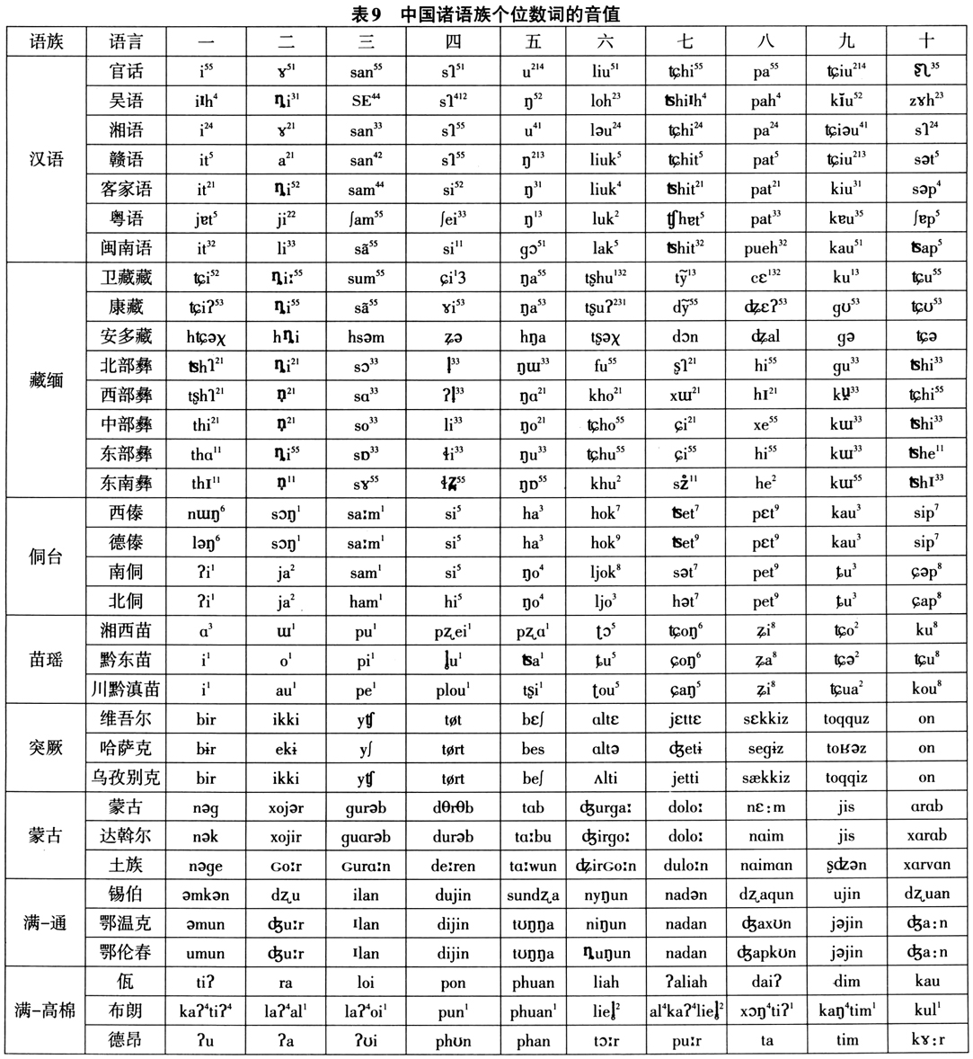 为进一步说明中国语言方言词汇语音形式的相似度,表9列举了汉藏语系汉语、藏缅、侗台、苗瑶诸语族,阿尔泰语系突厥、蒙古、满-通古斯诸语族和南亚语系孟-高棉语族等中国主要语族代表性语言或方言数词1-10的语音形式,这些数词可以100%地确定为相关方言甚至语言之间的同源词(除侗台语的数词是汉语借词外),但是由于词汇相似度并不取决于词语是否同源,因此不同语族的语言和方言词汇语音形式相似程度的差别可能甚大。如表中词语的实际音值可以非常直观地显示,中国北方阿尔泰语系突厥、蒙古、满-通古斯语族语言之间的词汇相似度,要明显地高于南方汉藏语系汉语、藏缅、侗台、苗瑶语族语言的方言之间,而其中苗瑶语族苗语的方言差异又是最大的。因此说明如果采用词汇相似度以及基于词汇相似度的通话可懂度标准识别语言,中国南方诸语族语言的数量和层次将极大地增加。