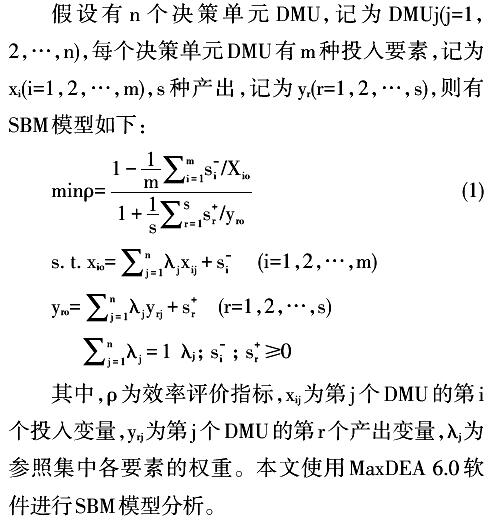 1.产出导向的SBM模型。基于产出导向的SBM模型是在现有投入相对稳定的前提下扩大产出[23],优势在于它将松弛变量纳入目标函数,以各项投入可缩减和各项产出可增加的平均比例测算无效率,使效率测算更为精确,更强调高校科技生产的利润最大化,这与高校科技创新资源配置追求效率提升的初衷更为相符。