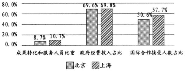 从图1反映的北京和上海高校的情况来看,北京高校在三个子维度科技资源配置方面的比例值均略低于上海,即成果转化和服务人员比重相对较低(8.7%),政府经费投入比例与上海基本持平,国际合作接受人数比例略低于上海,上海为57.7%,北京为50.6%。由此可见,北京高校更重视对原始创新的人员投入和赴外合作研究交流,上海更重视对科技成果转化方面的人员投入和国际合作研究交流。