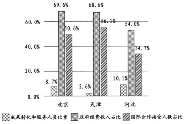 在人员投入结构方面,从成果转化和服务人员比重看,北京高校和天津高校更重视研发环节的人员投入,河北高校的成果转化和服务人员比重较高(10.1%),北京高校以8.7%列居第二,天津高校仅有2.6%。在经费投入结构方面,京、津、冀高校科技创新对政府经费投入的依赖度依次降低。北京高校科技创新最依赖政府经费投入,政府经费比例高达69.6%,天津高校其次(68.6%),河北高校的比例最低(54.0%),科技创新的其他经费来源占比相对较高。在高校科技创国际化方面,天津高校和北京高校表现突出,高于河北高校。从高校国际合作研究接受人数占比方面看,天津高校比例最高,为56.1%,北京高校居中,比例为50.6%,河北高校相对较低,为34.7%,一定程度上反映了天津高校科技创新的在地国际化水平相对较高。