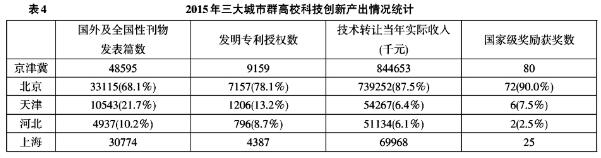 从高校科技产出的均衡程度来看,京津冀高校科技产出区域内分布不均衡,存在极化效应。从省际数据比较情况来看,北京高校贡献了京津冀地区高校科技创新产出的主体,平均贡献率在70%以上,而且贡献程度按照学术效益、经济效益和社会效益的顺序递增,产出效益在区域内分布极不均衡。