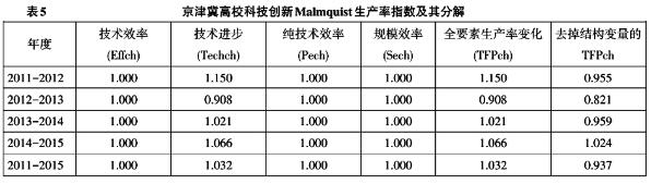 本文选取DEA-Malmquist生产率分解指数法,使用DEAP Version 2.1来分析高等学校创新能力提升“2011计划”提出以后(2011-2015年)五个年度京津冀高校科技创新的资源配置效率变化。