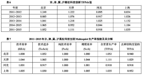 2.省际层面的科技创新效率变化情况。从2011-2015年北京、天津、河北三省市高校科技创新效率的整体变化情况来看,除河北高校科技创新效率有所下降之外,北京和天津高校均呈现上升态势,天津高校科技创新效率增长的幅度高于北京高校,北京高校科技创新效率增长幅度高于上海高校(见表6)。从年均全要素生产率的变化趋势来看,北京高校科技创新效率在2013年度经历了小幅下降,后逐年提升;天津高校科技创新效率在2011-2014年保持了增长态势,但2015年有所下降;河北高校科技创新效率不甚稳定,除在2014年较之2013年有所上升之外,其他年份均呈现下降趋势。上海高校的科技创新效率降低出现在2012年度,之后稳步上升。