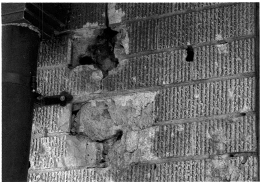 图5 林百货建筑外部的抓纹砖及二战时期遗留的弹痕(摄影:林孟怜)