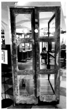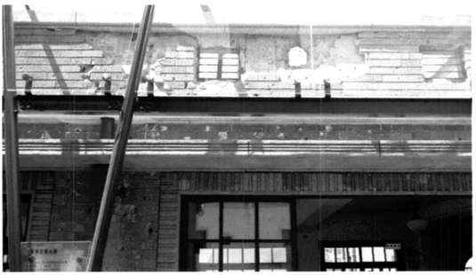 图12 林百货顶楼墙面遗留的二战时期弹痕被简单清理后,加罩保护和展示(摄影:林孟怜)