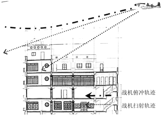 图13 林百货顶楼遗留的二战时期机枪扫射范围示意图[23]