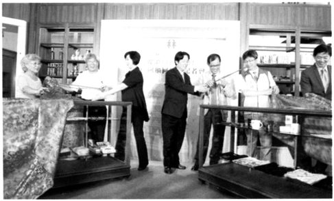 图14 旧玻璃柜回归林百货发布会,左2为捐赠者李建畿,左4为前台南市长赖清德,玻璃柜里展示了林百货的衍生纪念品[33]。