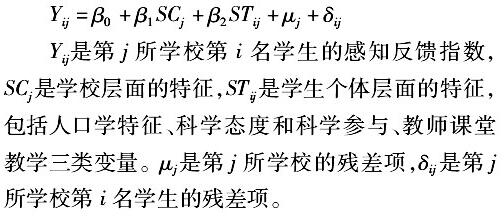 本文采用两层线性模型考察学生感知反馈对科学成绩的影响,将学生个体作为层1,学校作为层2。具体模型如下: