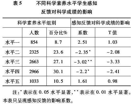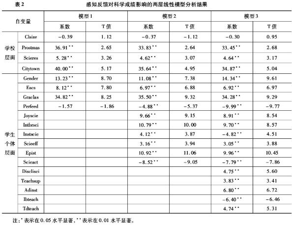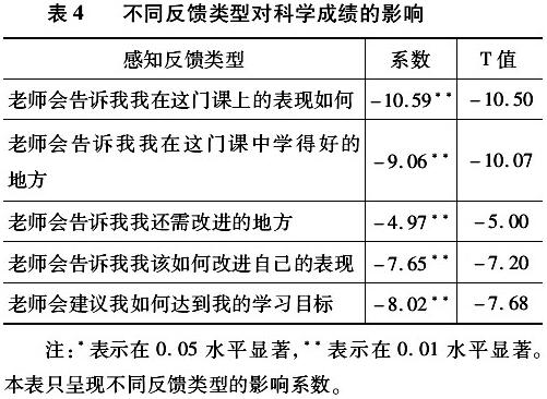表2列出了学生感知反馈对科学成绩影响的分析结果。
