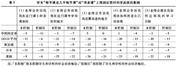 将测量感知反馈的5道题目视为5种不同的反馈类型,表3呈现了相对于“没有或几乎没有”或“有些课”得到反馈,学生在“每节课或几乎每节课”或“很多课”上得到不同类型的反馈时,其科学成绩的变化。换言之,相对于得到较少反馈,当学生得到较多反馈时的科学成绩的变化。由表可知,在未控制学生和学校的社会经济地位时,当学生得到老师较多的“我还需改进的地方”和“我该如何改进自己的表现”的反馈时,其科学成绩比得到较少这类反馈的学生分别高5分和1分;当学生得到较多的其他三类反馈时,其科学成绩比得到较少这三类反馈的学生有不同程度的降低。在控制学生和学校的社会经济地位后,除“我还需改进的地方”外,得到较多不同类型反馈的学生的科学成绩相比得到较少反馈的学生均有不同程度下降。