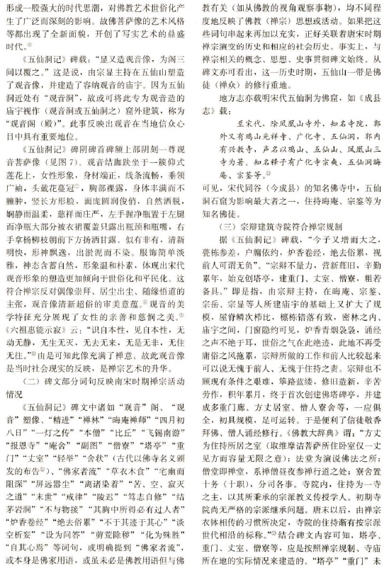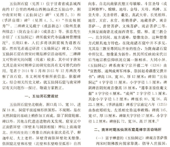 摘 要:《五仙洞记》碑碑阴阴刻富于禅意的观音菩萨像;碑文词句反映了禅宗活动情况;宗辩依禅宗规制建造寺院;五仙洞僧人重视自悟、自信、自主;"轻举之术"兼有三教因素,是佛教禅学、道教内丹学派、儒家心学理学相互融合的事例。故南宋时期五仙洞石窟是禅宗的一处活动场所。陇南禅宗与四川佛教有一定联系。南宋朝廷对五仙洞石窟僧尼和财产加强了管理,控制着陇南禅林。《五仙洞记》碑和《孚泽庙牒》碑为研究禅宗史提供了新的材料。