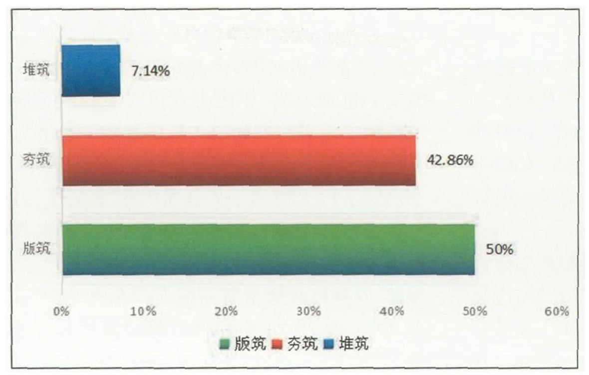(二) 主墙体史前城址在营建时往往多种技术并用, 以淮阳平粮台为例, 即存在堆筑、夯筑、版筑三种技术。为便于审视不同城址的城墙建筑技术, 我们以相关城址所使用的最高技术 (版筑高于夯筑, 夯筑高于堆筑) 为统计指标进行量化分析。就现有发现看, 河南史前城址使用堆筑技术的有西金城1处, 使用夯筑技术的有龙山岗、徐堡、新砦、蒲城店、高城、后岗等6处, 使用版筑技术的有西山、王城岗、古城寨、郝家台、平粮台、戚城、孟庄等7处 (图二) 。与其他地区相较[55,56,57,58], 河南史前城址不仅版筑、夯筑比例高, 而且夯窝较为明显, 多数呈圆形圜底状。同一城墙上夯窝大小、深浅大致相同, 可能反映了夯具的标准化趋势。以古城寨为例, 墙基底部使用石质夯具, 地面部分、墙体部分则使用圆形圜底的木质夯具, 夯窝成组分布, 可能为集束夯[17]。