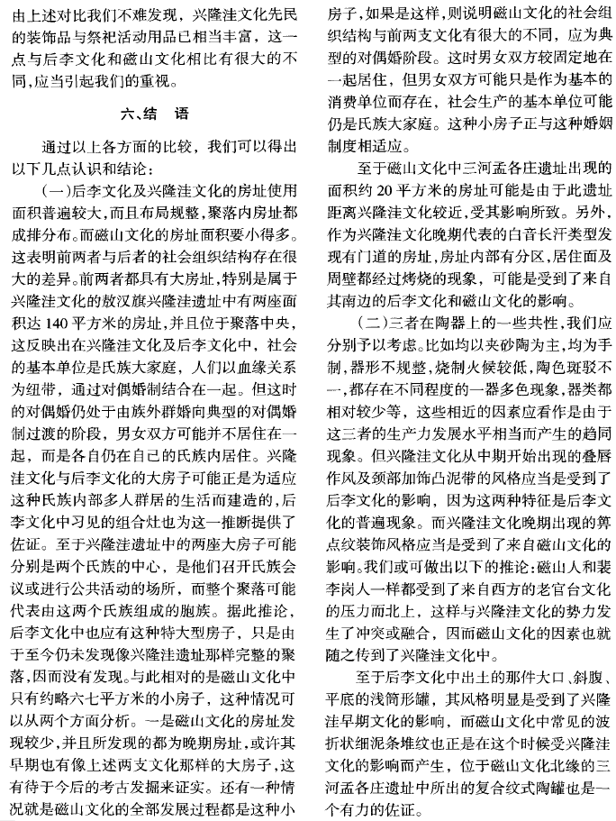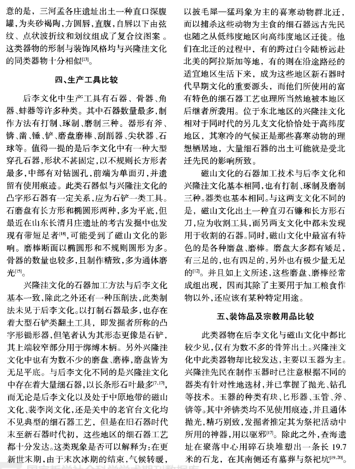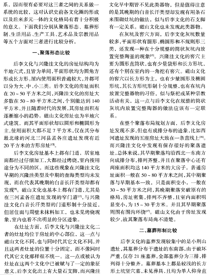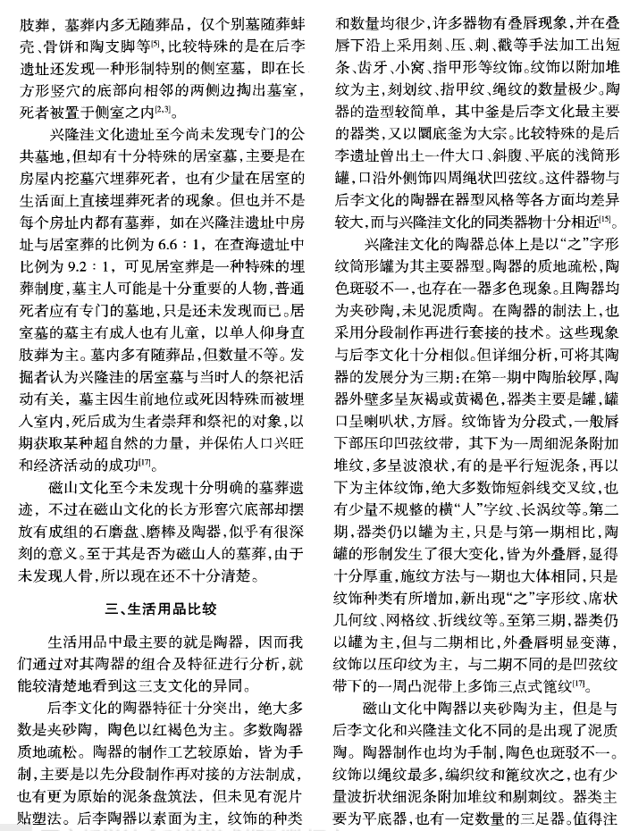 摘要:文章通过对后李文化与兴隆洼文化和磁山文化在聚落形态、基葬形制、生活用品、生产工具、艺术品及宗教用品的比较,得出北方地区基本处于同时期的这三支文化之间存在的共性和各自的特点以及形成的原因等。