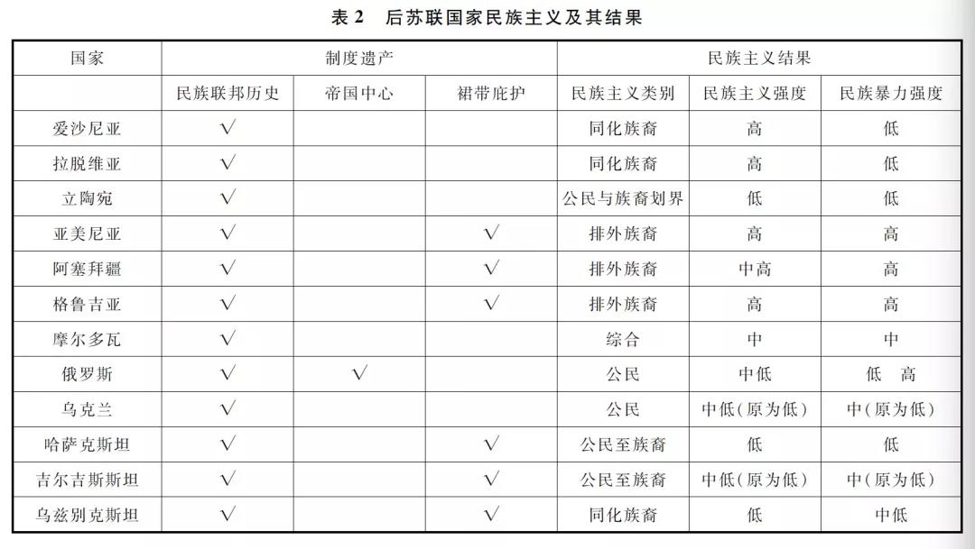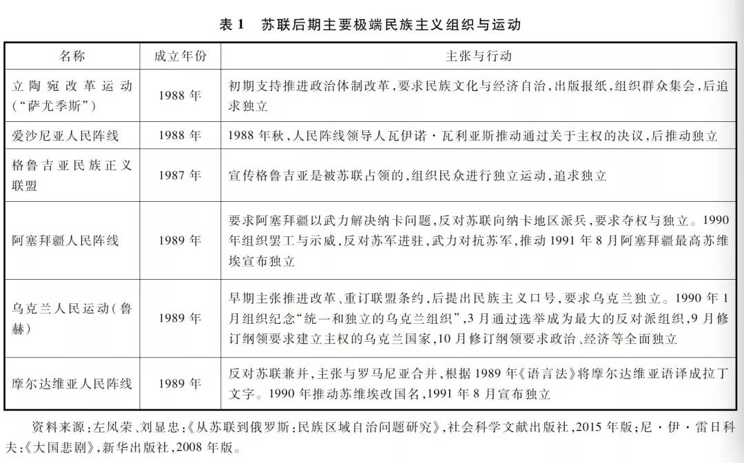 三是中国学界的研究。近年来,中国学者围绕民族问题与苏联解体、后苏联秩序产出了一系列成果。如左凤荣与刘显忠的合著《从苏联到俄罗斯:民族区域自治问题研究》系统研究了苏联与俄罗斯民族问题,认为苏联当局没能警惕与有效遏制极端民族主义,对俄罗斯与波罗的海等民族分离主义势力应对不力、妥协让步,听任苏联解体。