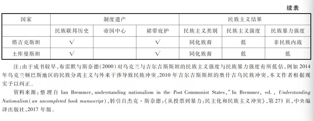 学者伊恩·布雷默(Ian Bremmer)从公民-族群维度对后苏联国家做出系统性排序,发现族裔民族主义与民族暴力程度成正比(见表2)。杰克·斯奈德(Jack Snyder)认为,族裔民族主义易引发激烈民族冲突,但当族裔民族主义、族群性被公民民族主义或公民性取代,则民族冲突便可避免,故公民民族主义是民族冲突的解药。